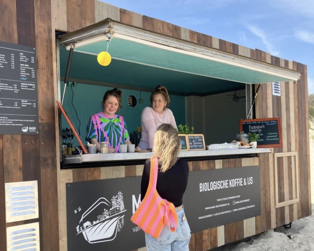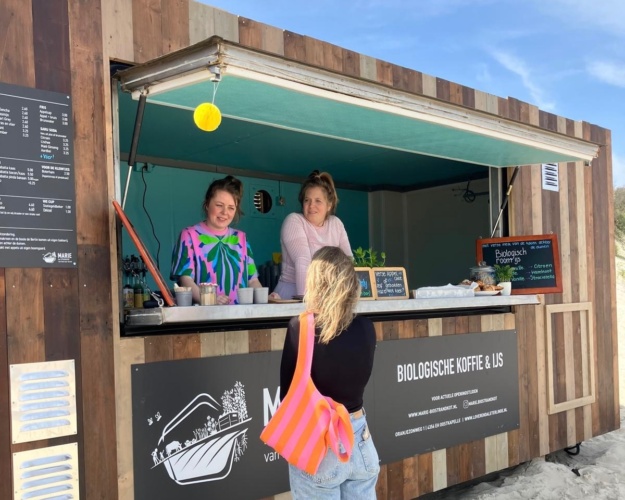 Bij Marie geniet je van echt goeie koffie, huisgemaakt ijs van de melk van onze koeien en andere lekkernijen rechtstreeks uit onze eigen bakkerij — daarmee willen we laten zien dat kwaliteit niet van ver hoeft te komen. Wat op het land achter de duinen groeit en op de boerderij wordt verwerkt brengen we via een korte weg (een kleine tien minuten fietsen) naar het strand, waar jij er van kunt genieten! Zo simpel kan het zijn.